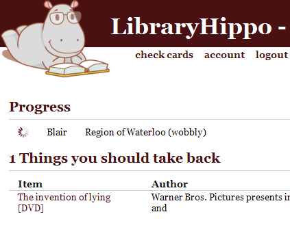 When using Firefox or Chrome, as soon as the page loaded, the user would see a list of cards that LibraryHippo was checking, complete with throbbers. As results came in, the matching progress line would disappear and other tables would fill in, holding the results – books that have to go back, holds ready for pickup, etc. I don't mind admitting that I was a little proud of my first foray into AJAXy web programming.